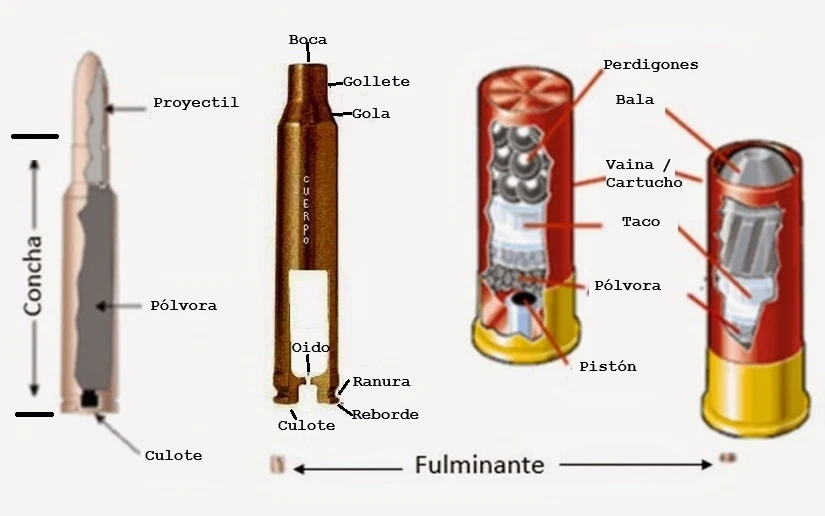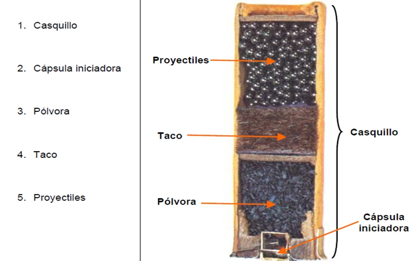 - Los cartuchos para escopeta estan formado por el casquillo, capsula iniciadora, pólvora (tambien denominada carga de proyección),
